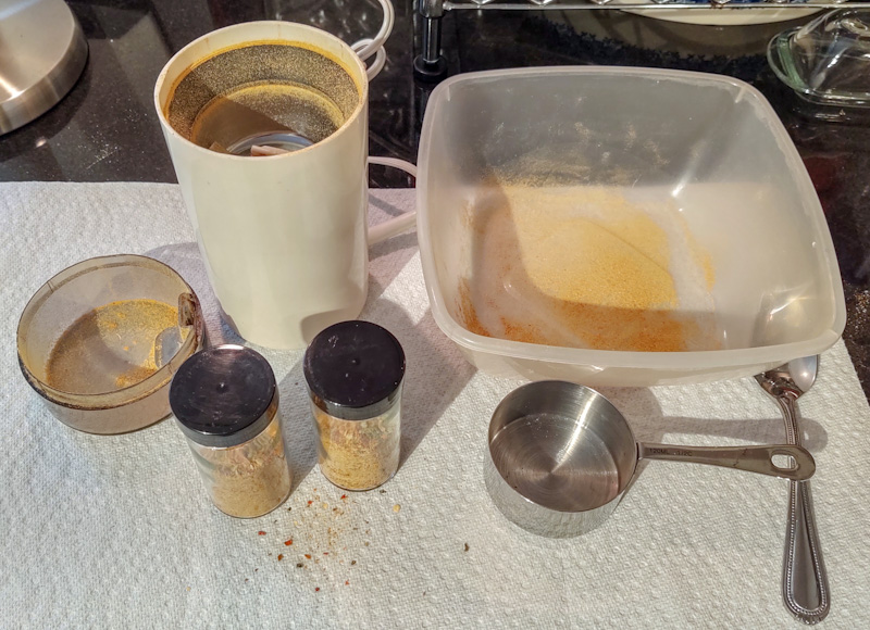 Utensils & Appliances: As shown below, an electric coffee grinder, a FoodSaver with vacuum attachments, two measuring cups, two plastic bowls, and two small spice shakers were all the utensils we needed.