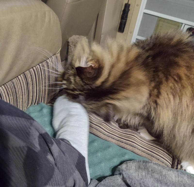 I dressed. I folded up blankets and restored ECDM to some semblance of order. Mr. Monte was immediately at my feet, purrrring. He was in an unusually friendly and happy mood. I knew not why.