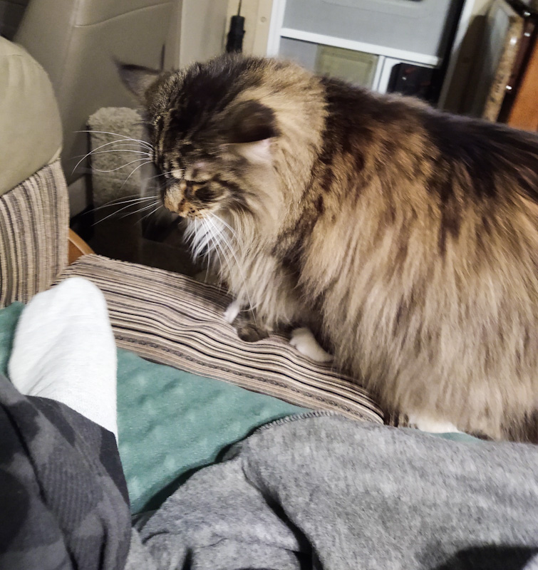 Wednesday night was his chosen date for the event. Without his usual complaints, he jumped into his carrier, welcoming the walk through the yard and arrival inside the RV. Once the carrier door was opened, he purrrred. He walked about the RV, inspecting everything and purrrring. He jumped into the upper bunk and purrrred. He rubbed past my legs and purrrred. – – He moved like a shark circling his prey – but this shark purrrred.