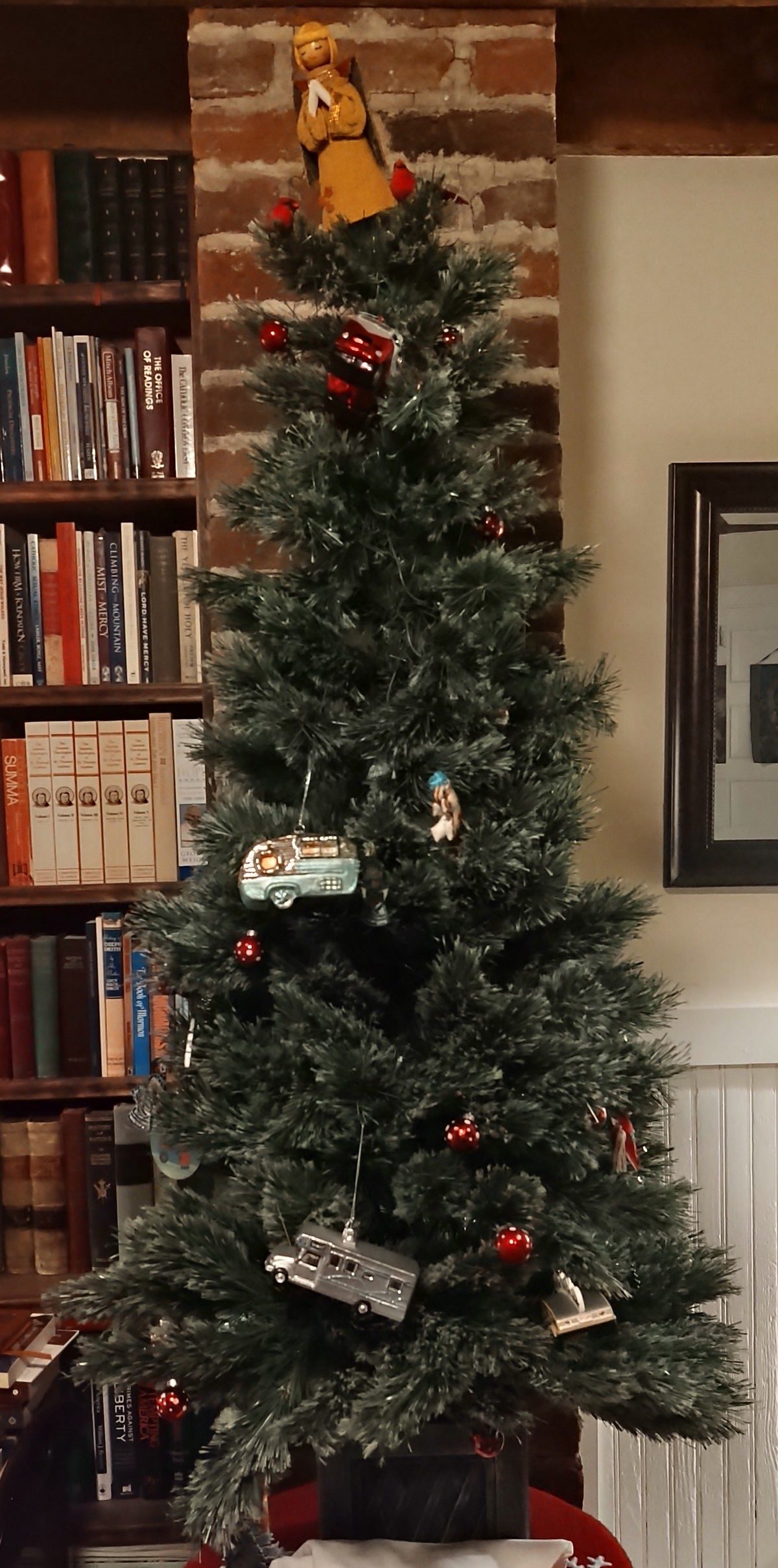 It took about 10-15 minutes before it was safe for me to move from my chair. Together, my beautiful Bride and I resumed the search for fallen ornaments. Then, we reassembled the tree and hastily returned it to the table where it had been placed so carefully on December 23rd. – – The only fact that made this matter less bad than it could have been, was that not a single ornament was broken.