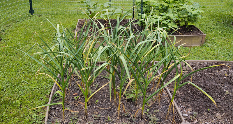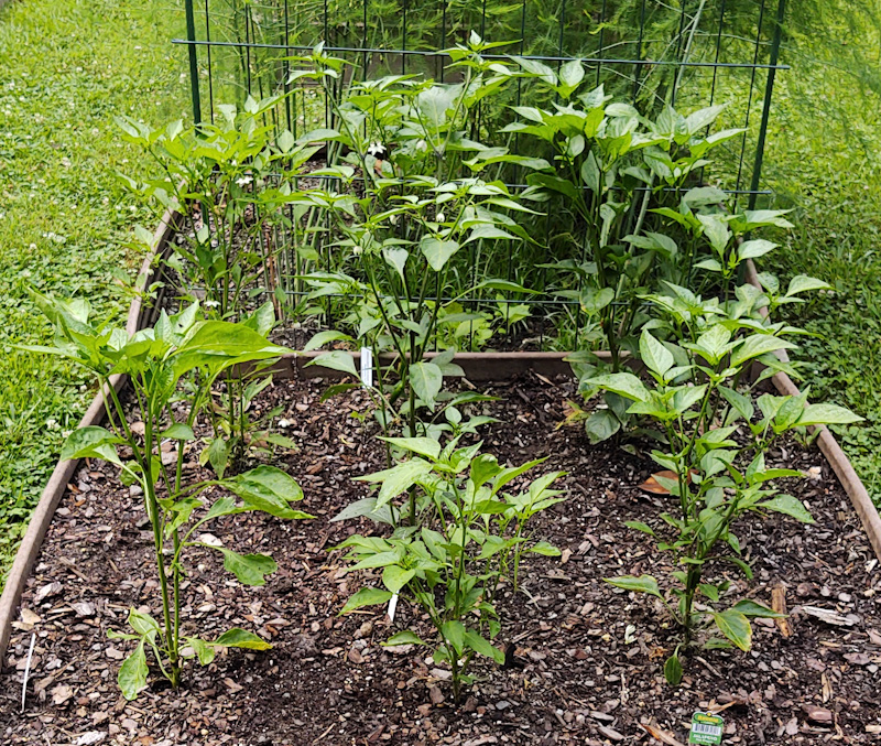 In the process, we’ve noted that some of our older raised beds are getting “long in the tooth.” They are warping and no longer hold together on their own. Hubby has temporarily reinforced the boxes with short fence posts.